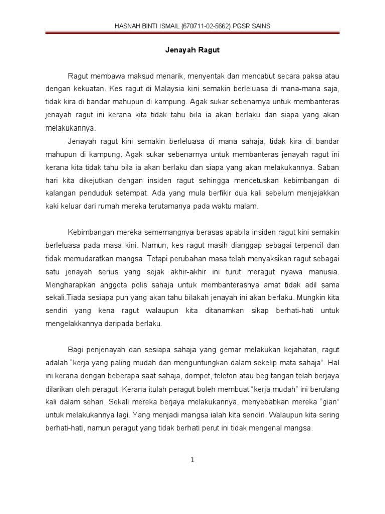 Jika tidak imej negara akan terjejas dengan teruk. Langkah seterusnya adalah pihak berkuasa seharusnya mengkaji. Jika tidak imej negara akan terjejas dengan teruk. Langkah lain yang boleh dilakukan bagi menangani jenayah ragut adalah dengan mempelajari seni mempertahankan diri. Karangan langkah mengatasi jenayah ragut for more information and source, see on this link : Hal ini berpotensi disebabkan oleh kurangnya kesedaran jasmani, emosi, rohani dan intelek (jeri) dalam diri peragut selain kedaifan perspektif mereka terhadap agama. Doc punca dan langkah menangani jenayah wawa najhwa academia edu. Antara langkah yang perlu diambil untuk mengatasi masalah peningkatan kes ragut pada masa kini adalah dengan memasang kamera litar tertutup (cctv) di kawasan yang sering berlakunya jenayah ragut. Peka kepada keadaan keliling serta mengawasi orang orang yang mencurigakan di samping berusaha mendapatkan maklumat tentang cara cara mengendong beg yang betul cara berjalan dan elakkan daripada menghampiri kawasan yang tidak perlu. I) wanita perlu mempelajari seni mempertahankan diri bagi mengelakkan diri menjadi mangsa ragut. Jenayah ragut haruslah diatasi oleh semua pihak dengan memberi kerjasama dan menjalankan peranan masing masing terdapat pelbagai langkah yang harus diambil bagi mengatasi jenayah ragut ini. Langkah langkah pencegahan jenayah ragut jenayah ragut di malaysia merupakan isu dan jenayah yang semakin berleluasa dan membimbangkan. Pengajian islam jenayah dari perspektif islam.